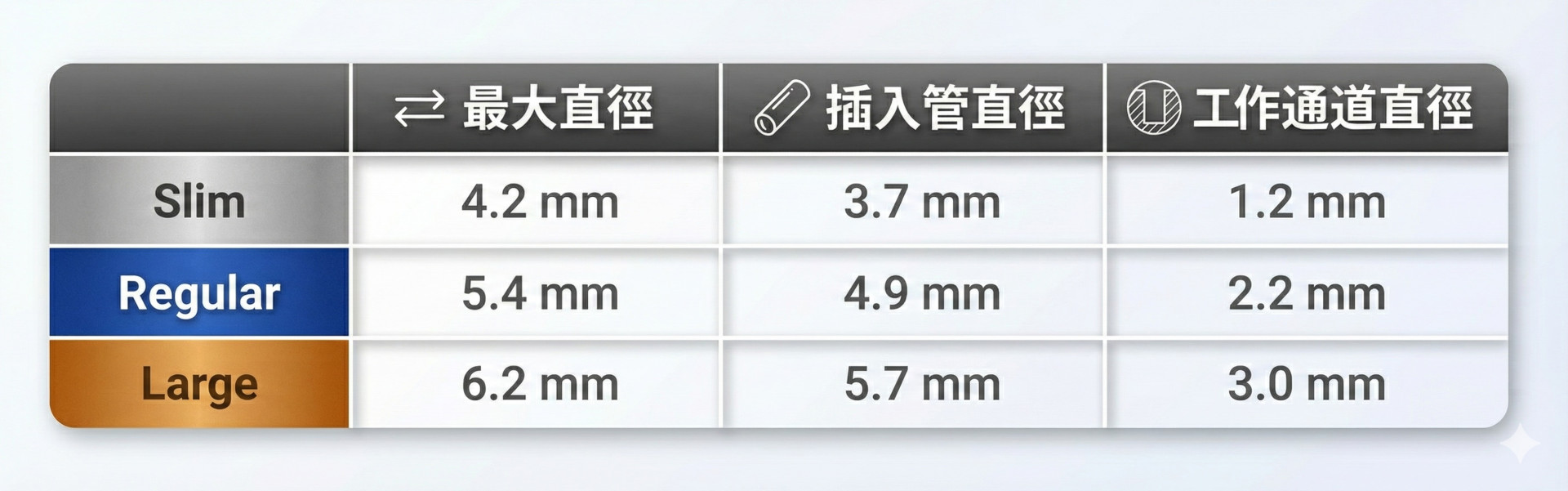 Regular (標準): 平衡外徑與工作通道,適合常規檢查與抽吸。
